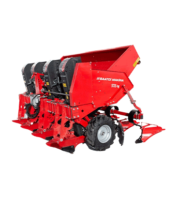 Saatci Makina STE-14 hafif yapıda, askılı tip 4 sıralı ekim makinesidir. SAATCİ MAKİNA STE-14 ekim makinesi, tarlada çok hassas ve eşit ölçüde bir ekim mesafesi için doğru seçimdir. Bununla birlikte iyi kalibre edilmiş tohumluk yumruların kullanılmasıyla yüksek hızda ekim imkanı sunar . Karık biçimlendirme sacı, toprağa ekilen yumruların eşit şekilde kapatılmasını sağlar.Yüksekliği ayarlanabilen dört adet tekerlek, çok yumuşak topraklarda çalışabilmeyi mümkün kılar. Devirmeli hazne sayesinde rahat tohum doldurma olanağı sunar.